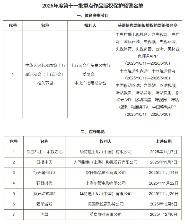 按照国家版权局《关于进一步加强互联网传播作品版权监管工作的意见》《关于开展院线电影版权保护专项工作的通知》及版权重点监管工作计划,根据相关权利人上报的作品授权情况,现公布2025年度第十一批重点作品版权保护预警名单。