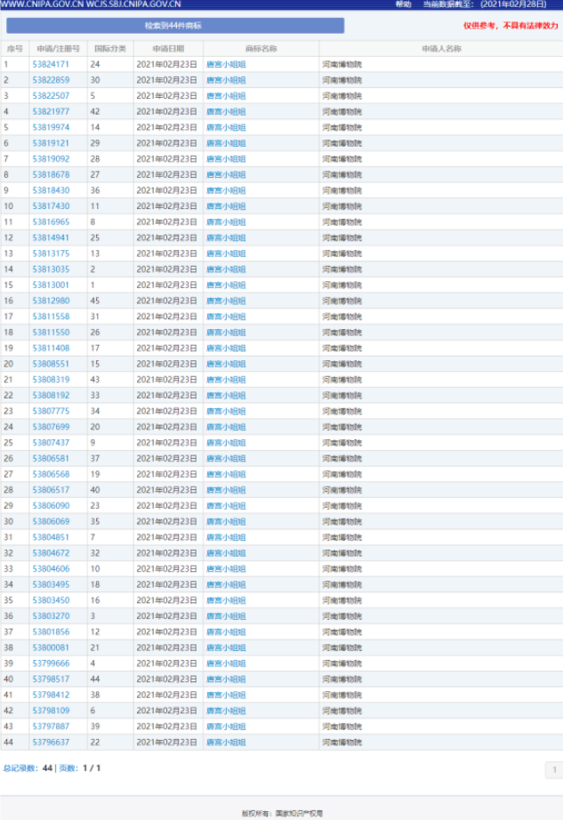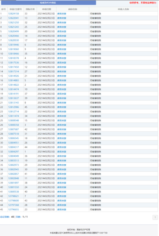 此外,记者查询到,在河南博物院之前,已有多家企业和多个自然人就“唐宫夜宴”提交了商标注册申请,最早的一件“唐宫夜宴”商标由自然人杨某某于2月18日在第35类商品或服务上提交注册申请。