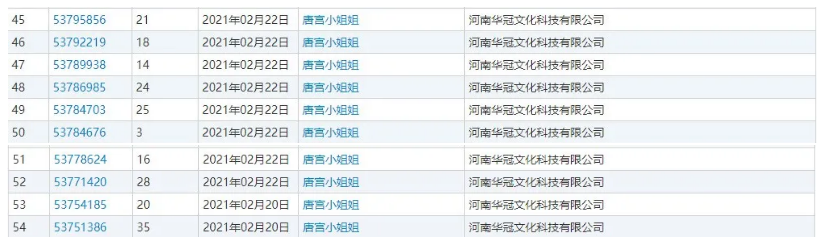 记者查询到,在河南博物院之前,2月20日和2月22日,河南华冠文化科技有限公司就“唐宫小姐姐”提交了10件商标注册申请(详情见下图3),目前这10件商标也处于等待受理中。